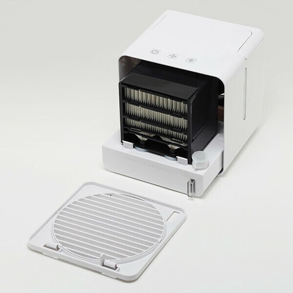 ●気化熱現象を利用し、扇風機より涼しい冷風を体感。エアコンとは違い、水分を含んだ冷風なので、空気が乾かず快適です!